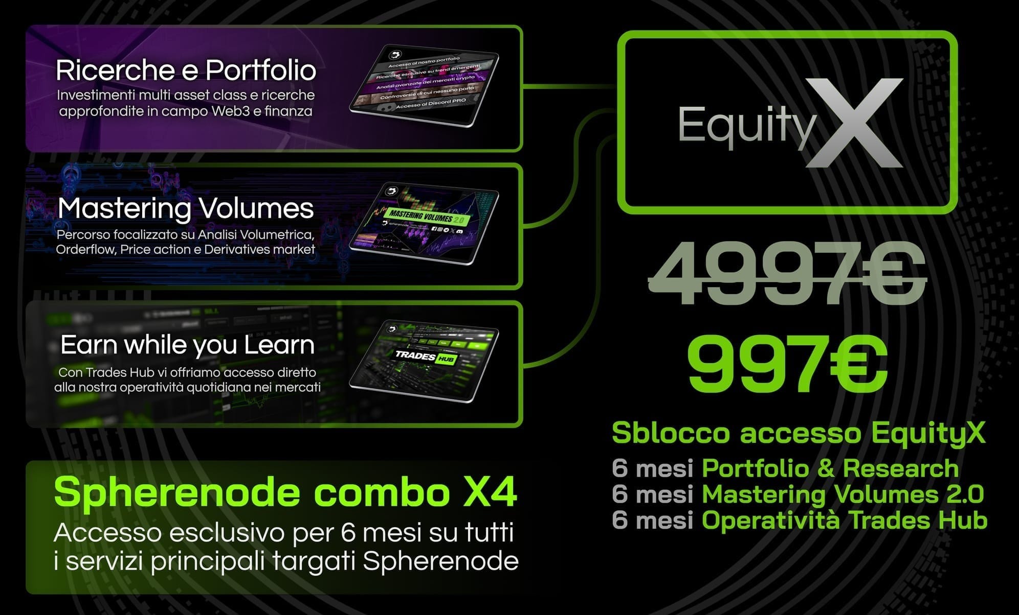 Accedendo a questa combo avrai la possibilità di entrare a far parte di Equity X, programma pensato per ridurre drasticamente il tuo sforzo sui mercati e copiare direttamente dai nostri trader in maniera efficiente tutte le loro operazioni.